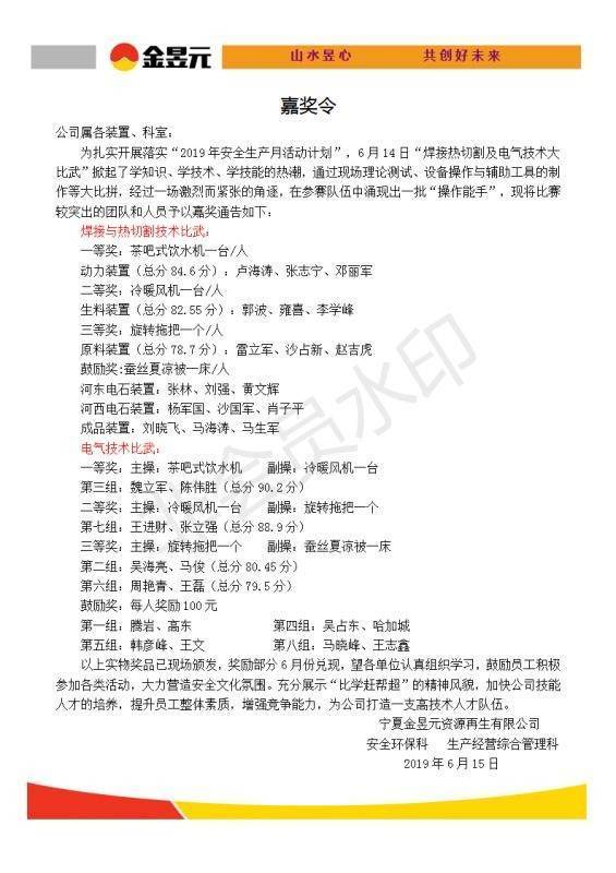 比賽結(jié)束后,公司對此次參加比賽的所有人員頒布了嘉獎令,鼓勵員工在今后的工作中提高操作水平,努力奮進,爭做優(yōu)秀員工!