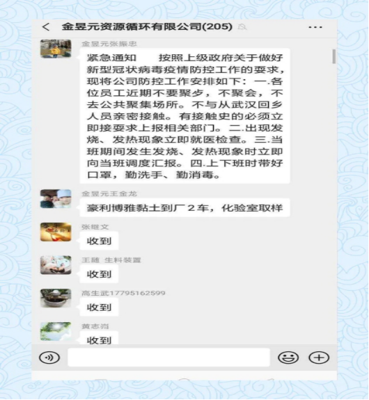 寧夏金昱元資源循環(huán)有限公司加強對春節(jié)期間接觸從湖北、武漢返鄉(xiāng)的人員進行摸排、排查,加大員工群體的排查管控力度,做到每日防控,每日報平安,登記外出員工動態(tài),密切關(guān)注員工身體情況,引導(dǎo)廣大員工加強防范,切實增強自身防護能力。