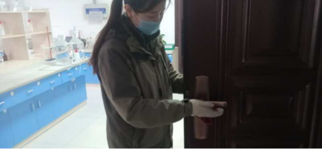 擦拭操作臺(tái)、門把手,工作的有條不紊。