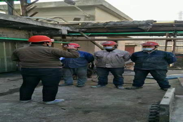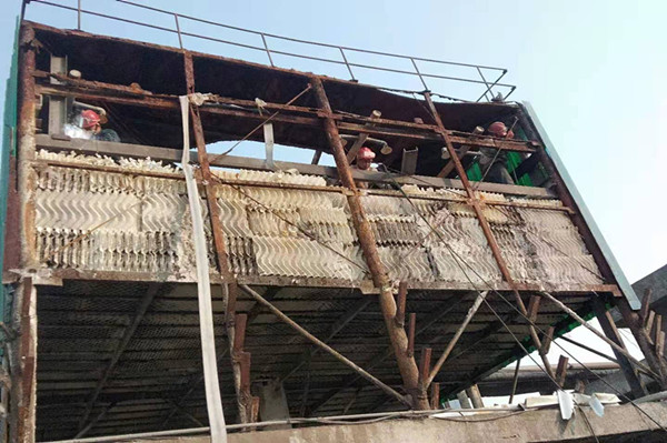 在完成相關(guān)作業(yè)的準(zhǔn)備工作,穿戴好各類防護(hù)用品,簽發(fā)了各類票證后,大家就進(jìn)入到檢修現(xiàn)場。加固冷卻塔前,必須先拆除冷卻塔壁板,清洗冷卻塔填料雜物及易燃易爆物質(zhì)。由于冷卻塔結(jié)構(gòu)腐蝕嚴(yán)重,填料內(nèi)部含易燃易爆物質(zhì)多,所以必須對冷卻塔進(jìn)行多次沖洗徹底除去易燃易爆物質(zhì)才能進(jìn)行動火加固作業(yè)。