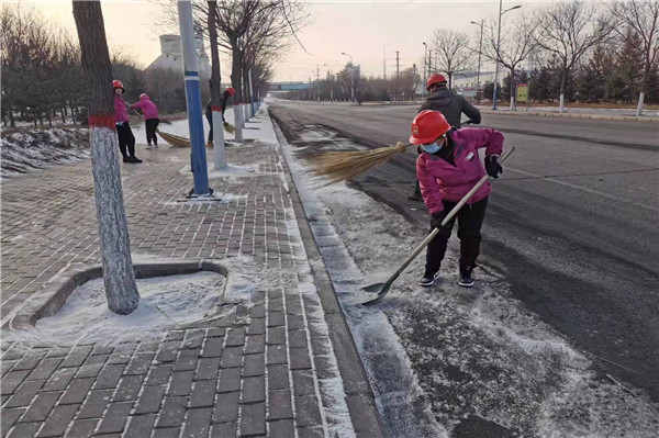 裝置門前的松樹上掛滿雪球看著調(diào)皮且可愛,九點過后太陽開始照射,遠遠望去整個廠區(qū)銀光閃閃,讓人移不開眼。雖然雪景美麗但因為路面積雪會導致員工滑倒等危險,且廠區(qū)其他生產(chǎn)場地都需繼續(xù)生產(chǎn),不能因下雪而影響,所以在欣賞完雪景后的我們也開始了積雪大清掃活動。