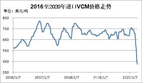 在需求增長和美國頁巖氣革命的推動下,近年來,全球乙烯行業(yè)進入新一輪擴能高峰期,供應趨向?qū)捤桑蚁┦袌鲞\行中樞下移。油價暴跌,乙烯的成本端支撐塌陷,乙烯市場加速下跌,乙烯法PVC的生產(chǎn)成本進一步下降。截至2020年4月上旬,亞洲乙烯CFR東北亞報405至415美元/噸,較年初下跌逾40%。全球VCM市場供需相對平衡,價格波動幅度較小。2018年至2020年初,亞洲乙烯CFR東北亞價格大體在650-800美元/噸之間震蕩。受油價下跌影響,VCM價格大跌,2020年4月上旬,亞洲乙烯CFR東北亞報423-425美元/噸,較年初下跌近40%。