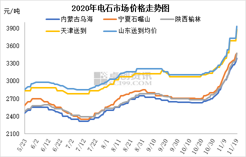整體市場(chǎng)描述:上周五至今電石價(jià)格繼續(xù)快速上漲,各地采購(gòu)價(jià)連續(xù)上調(diào)300-400元/噸,電石出廠價(jià)上調(diào)200元/噸左右,且烏海及周邊貿(mào)易出廠價(jià)推出了明日繼續(xù)上漲100元/噸計(jì)劃。至此,10月下旬至今,電石價(jià)格已連續(xù)上調(diào)了700-800元/噸,達(dá)到2011年9月以來的最高水平。本周電石價(jià)格仍在繼續(xù)上調(diào),主要仍因供需失衡,貨源緊俏推動(dòng)。內(nèi)蒙古地區(qū)電石仍頻繁有不同程度的限電現(xiàn)象,產(chǎn)量不足,寧夏石嘴山地區(qū)受重污染天氣影響,本周后期有電石爐降負(fù)荷現(xiàn)象,外加其它復(fù)工電石爐恢復(fù)緩慢,電石增量較為有限;但PVC價(jià)格仍在連續(xù)上漲,前期停車PVC企業(yè)也有復(fù)產(chǎn),整體開工高位,部分甚至超負(fù)荷運(yùn)行,外加冬季來臨前對(duì)電石也有補(bǔ)庫需求,整體需求維持高位,綜合導(dǎo)致電石貨源持續(xù)緊張,價(jià)格得以連續(xù)上揚(yáng)。